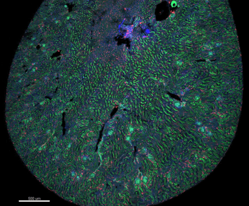 Imaris rendering of 3D confocal microscopy volume of human kidney tissue.