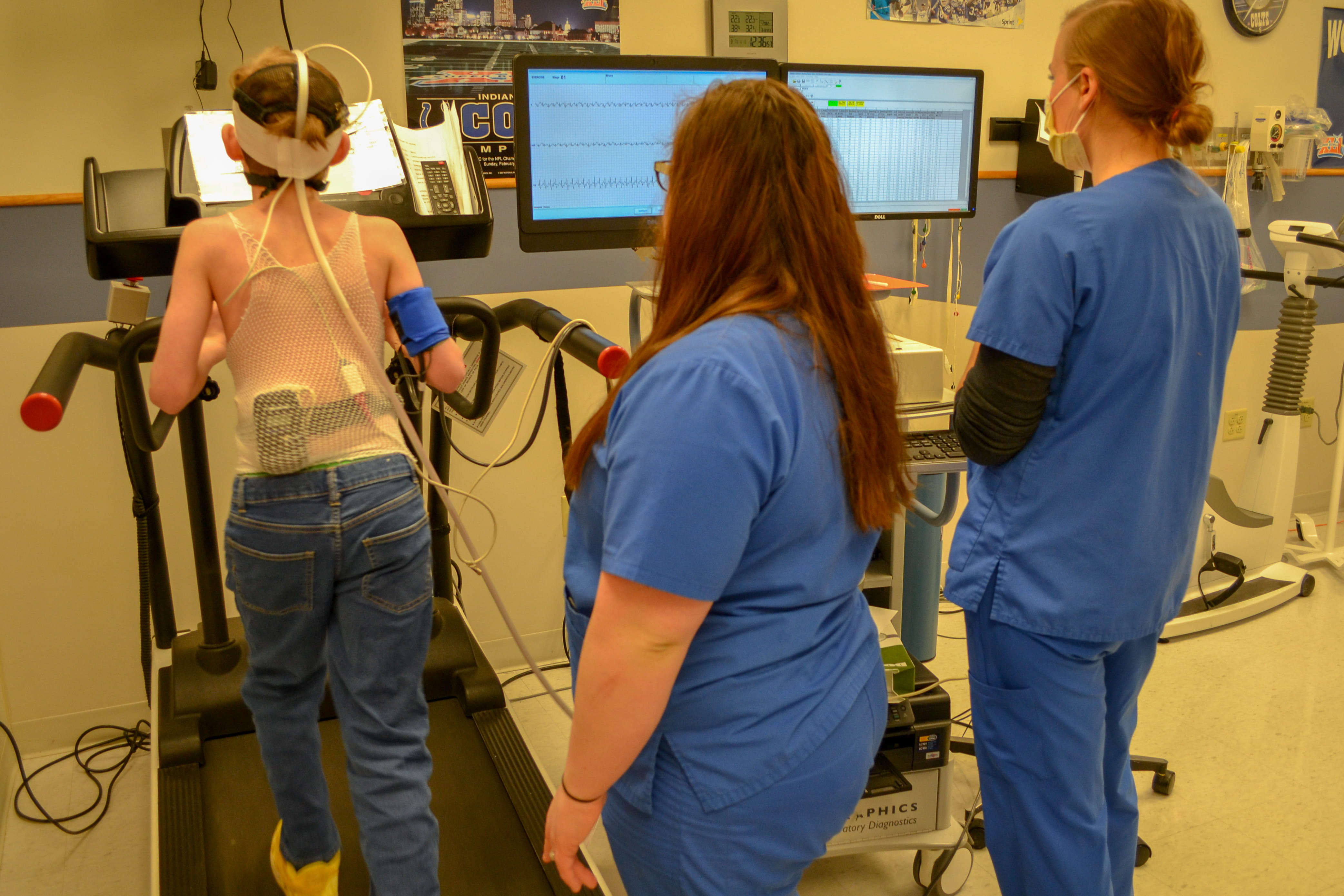 More than 350 cardiac exercise stress tests take place at Riley Hospital for Children each year in a laboratory dedicated to sophisticated evaluation of the response to maximal exercise. Reasons for exercise stress tests vary from cardiac clearance for school sports to evaluations after fainting episodes, exercise-induced chest pain, abnormal heart rhythms, cardiac surgery or heart transplantation. State-of-the-art equipment used for exercise testing includes treadmills and bicycles with computer-controlled workload adjustments, measurement of peak oxygen consumption, blood oxygen saturation, continuous heart rate and rhythm, blood pressure, and other respiratory and metabolic parameters. The pediatric cardiology team utilizes an exercise physiologist to coordinate exercise stress tests, provides individualized exercise programs for patients, and assists in exercise-related research endeavors.
