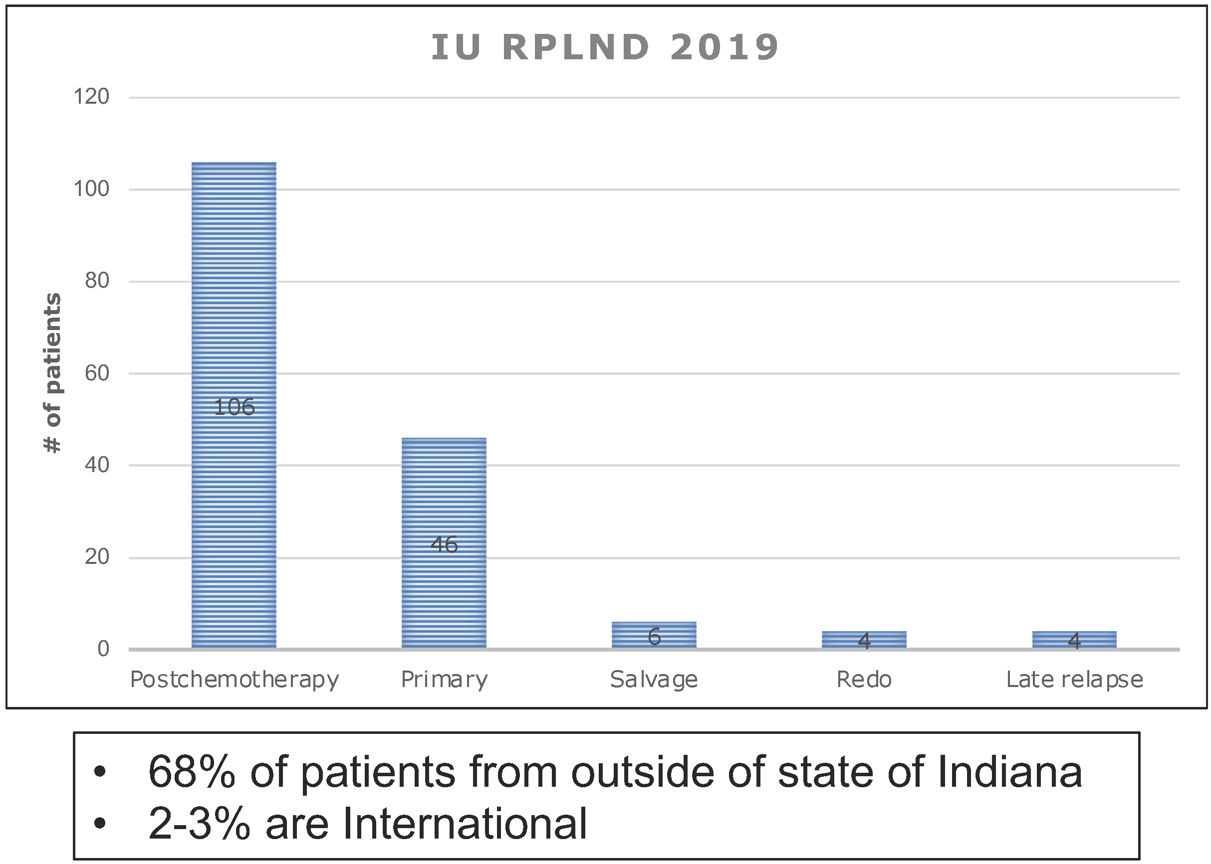 In terms of contemporary data, the department maintains a robust surgical experience as demonstrated in the table to the right, with over 160 RPLNDs performed at IU Health in 2019, the majority of which are complex posthchemotherapy resections (64%) and from outside the state of Indiana (68%).